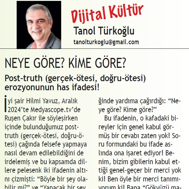 Nesnelliğin, gerçekliğin geçici kişisel arzu-inanç-duygulara feda edilmesine tahammül edemeyen bireylerin bu ifadelerine karşılık, son dönemde her türlü bencilliği-kibri-kişisel arzuyu her şeyin üstünde tutan bireylerin de popülerleştirdiği bir ifade var: “Neye göre? Kime göre?” Kendisini toplum içinde (o an için ya da genel olarak) yeterince güçlü hissetmeyen bireyin dört elle sarıldığı: “Neye göre? Kime göre?” Köşeye sıkıştığında, ne yapacağını, bencilliğini nasıl meşrulaştıracağını bilemediğinde yardıma çağırdığı: “Neye göre? Kime göre?”